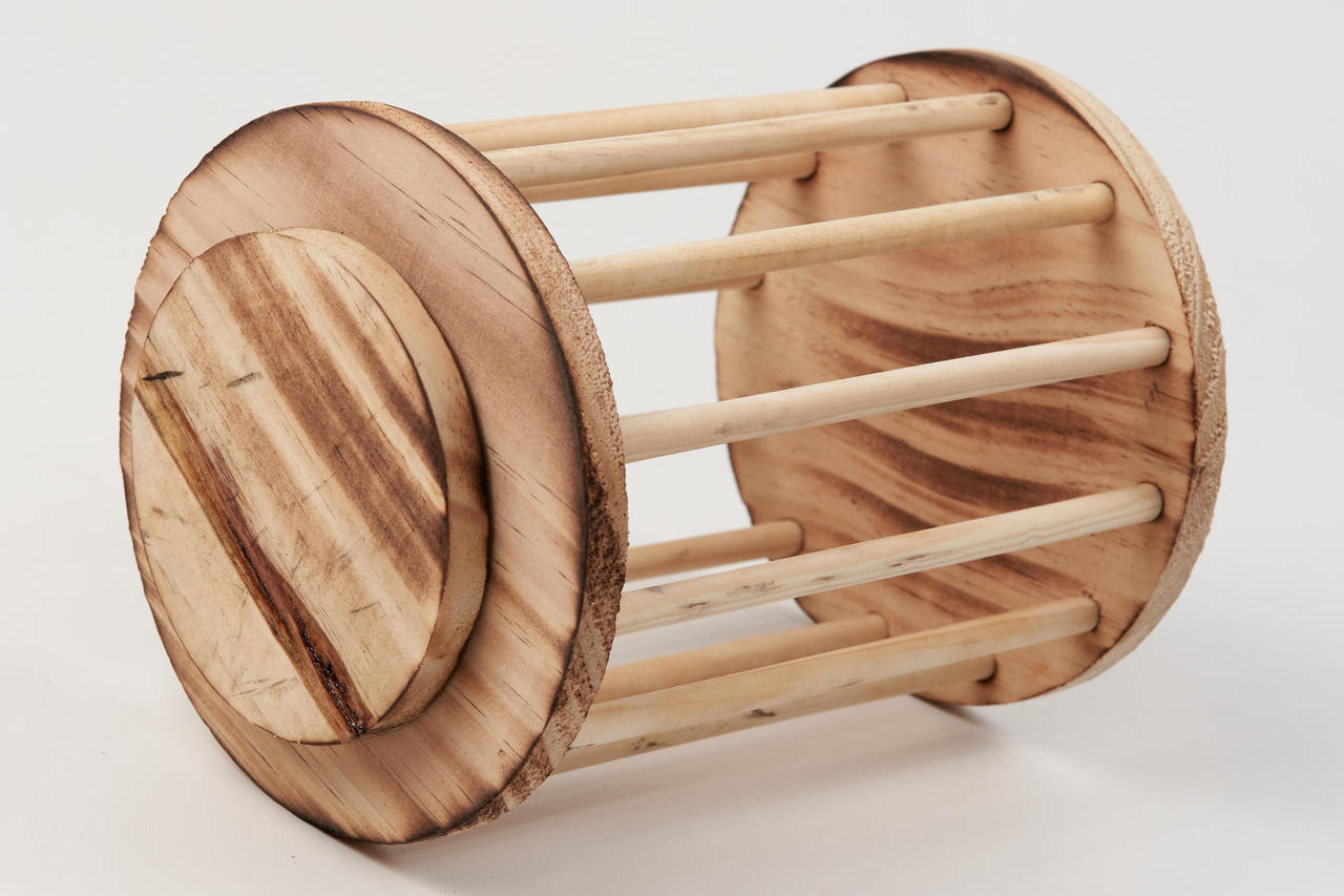 Puidust heinahoidja. Ühelt küljelt on heinasõim avatav heinaga täitmiseks. Heinahoidjast heina kakkumine on loomale peale toitumise ka aegaviitva ja mängulise loomuga tegevus. Heinahoidjat on võimalik loomal mööda põrandat veeretada.